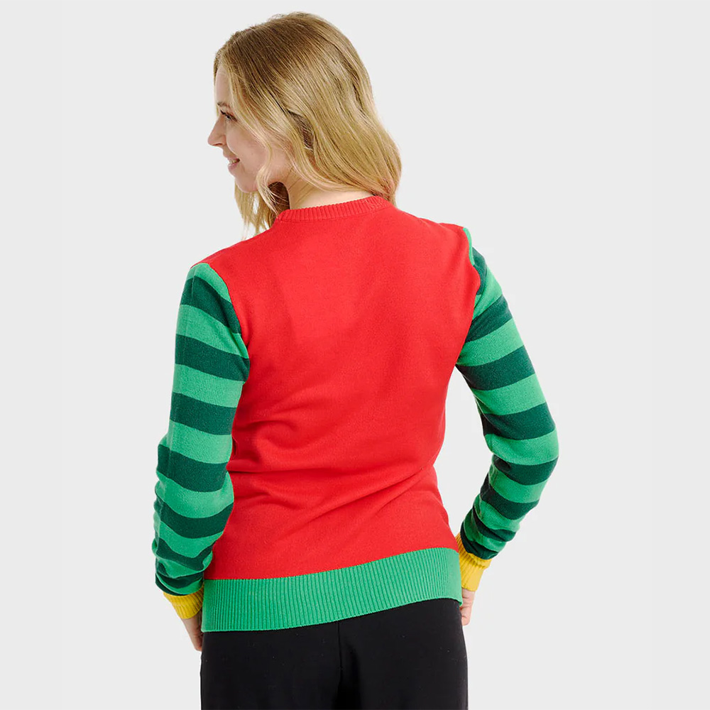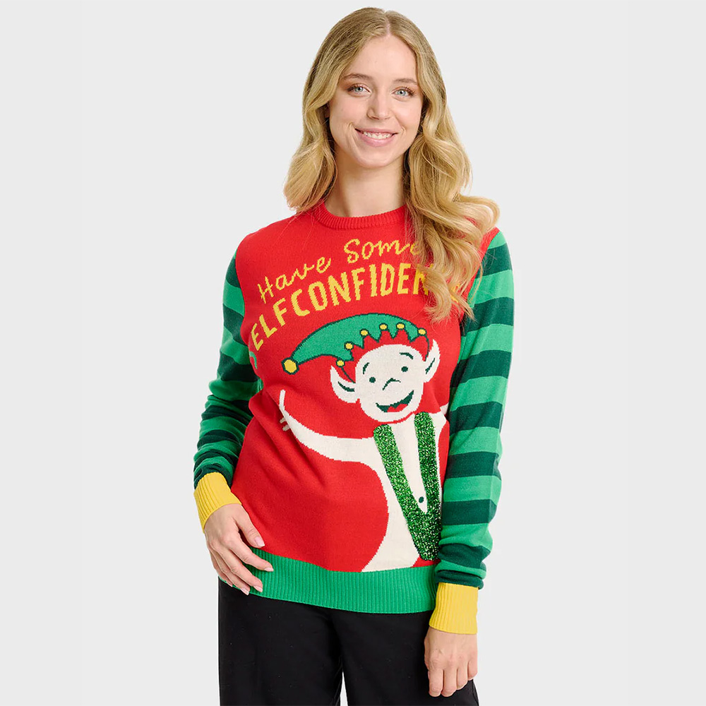 Deze vrolijke dames kersttrui heeft een belangrijke boodschap: have some sElfconfidence! De vrolijke elf in een met pailetten gedecoreerde Borat zwembroek en de gestreepte groene mouwen maken deze dames kersttrui een instant hit.