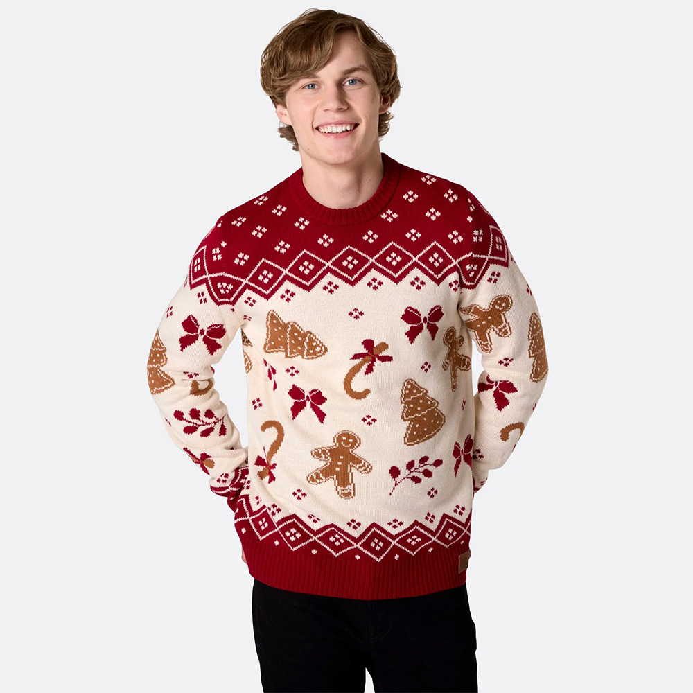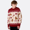 Deze foute heren kersttrui barst bijna uit zijn naden van de kerstsfeer! De knusse rood/witte kleurstelling, de decoratie met peperkoek, strikken en mistletoe: als deze trui u niet in de kerstsfeer brengt, weten wij het ook niet meer…