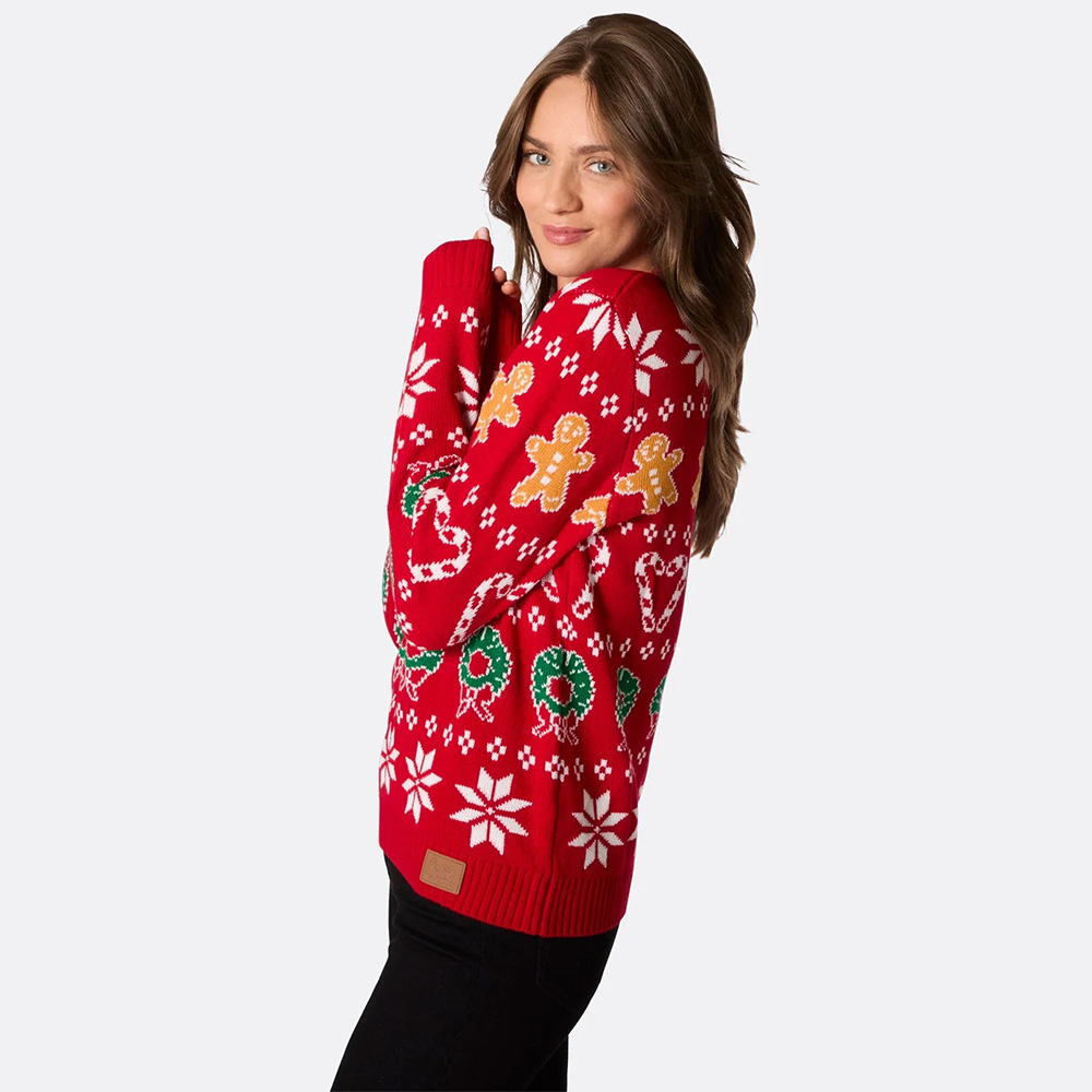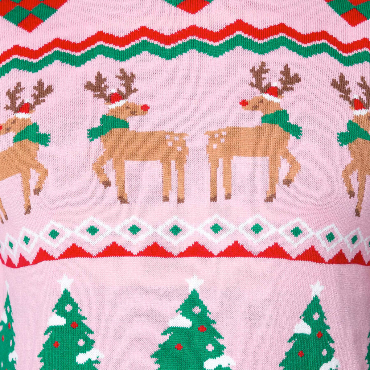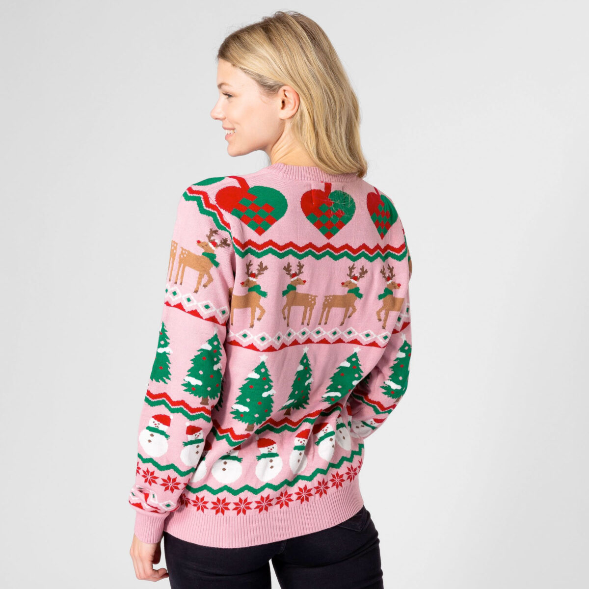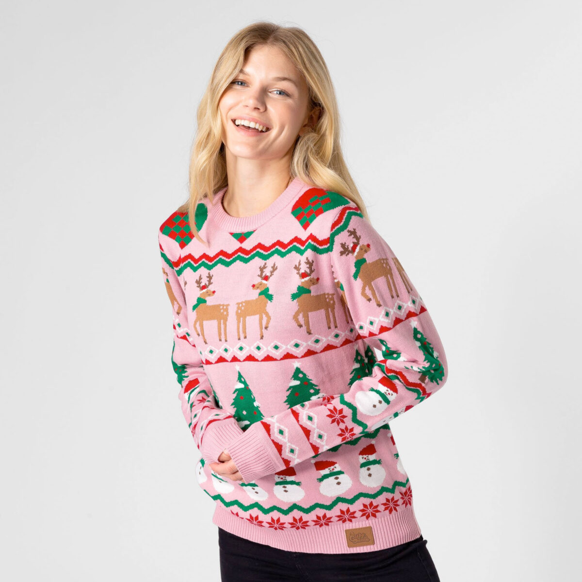Deze dames kersttrui heeft volgens ons precies de juiste hoeveelheid foutheid om leuk te zijn! De trui is gedecoreerd met verschillende kerstpatronen, zoals herten, kerstbomen en sneeuwpoppen. De basis van de trui is roze, maar er zijn ook soortgelijke opties in groen, donkerblauw en rood verkrijgbaar. Deze trui is ook verkrijgbaar voor heren!