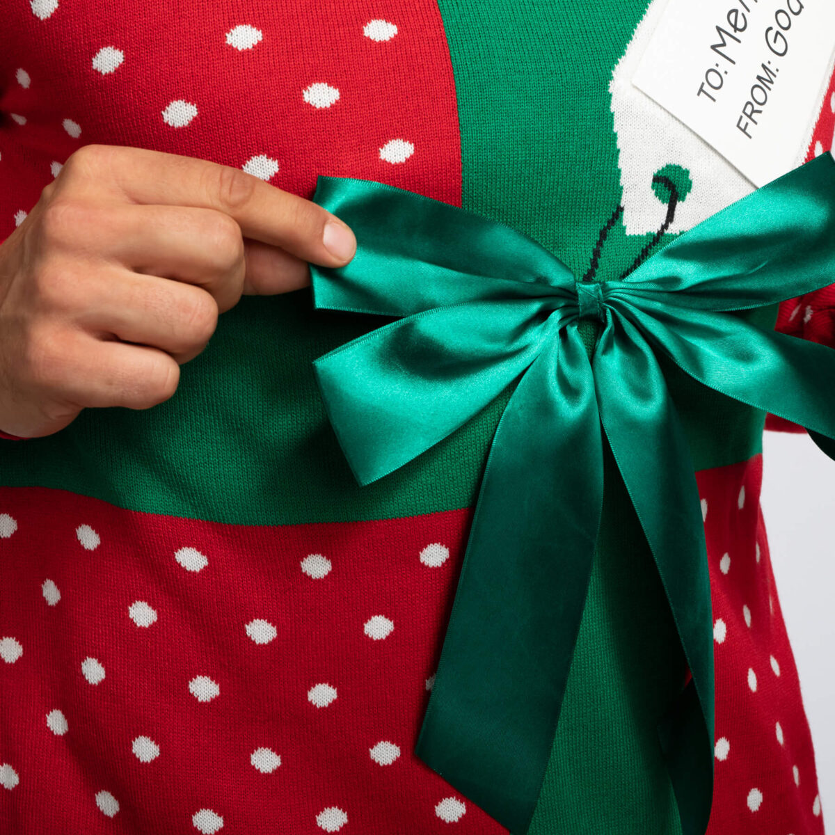 Met deze ondeugende foute dames kersttrui wordt duidelijk wat iedereen natuurlijk eigenlijk al wist: jij bent Gods cadeau aan alle mannen…of vrouwen…of iemand in het bijzonder? Jij kiest, want de trui komt met 3 verwisselbare kaartjes die op de trui bevestigd kunnen worden: