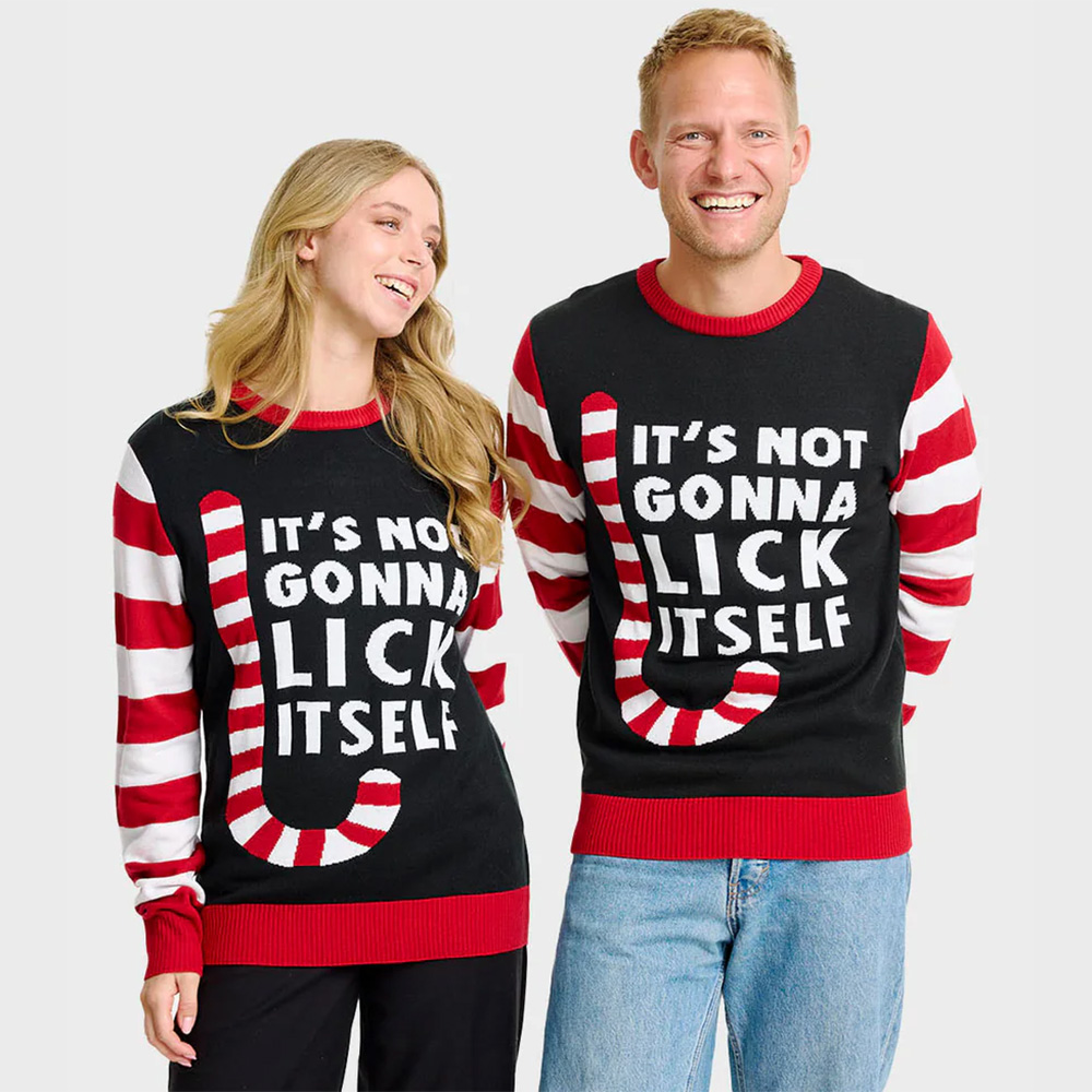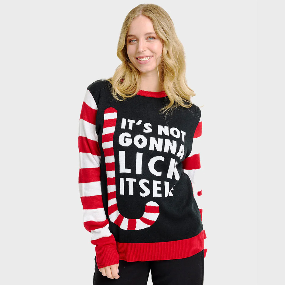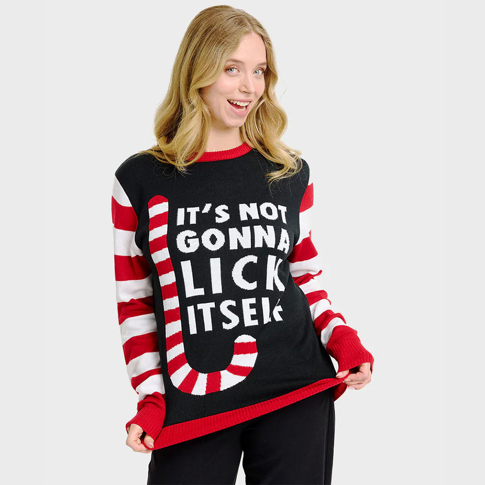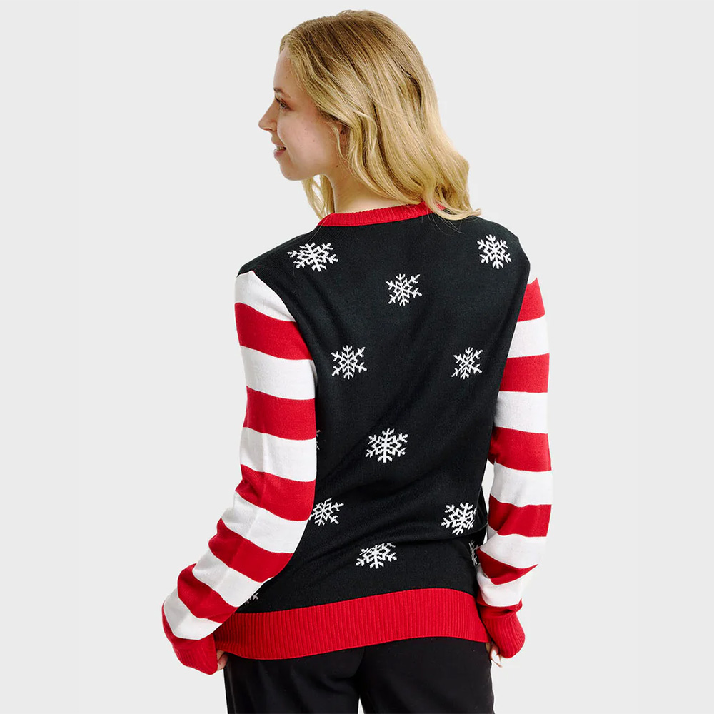 Deze vrolijke dames kersttrui heeft een grappig, tikkeltje ondeugende boodschap. De zwarte rui heeft rood-wit gestreepte mouwen en is daarmee niet te missen!