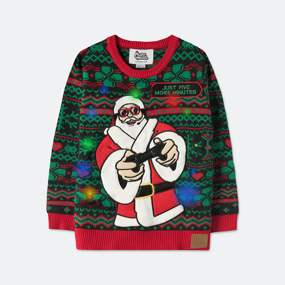Deze foute kersttrui voor kinderen haalt álles uit de kast! Als de gamende Santa, compleet met headset, niet genoeg is, dan steelt de in de trui verwerkte LED verlichting wel de show!