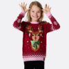 Deze vrolijke foute kinder kersttrui heeft Clarice het rendier voorop, het vriendinnetje van Rudolph. Met kerstballen in haar gewei en een mooie strik die schitteren en glinsteren van de pailletten is zij klaar voor elke kerst party!