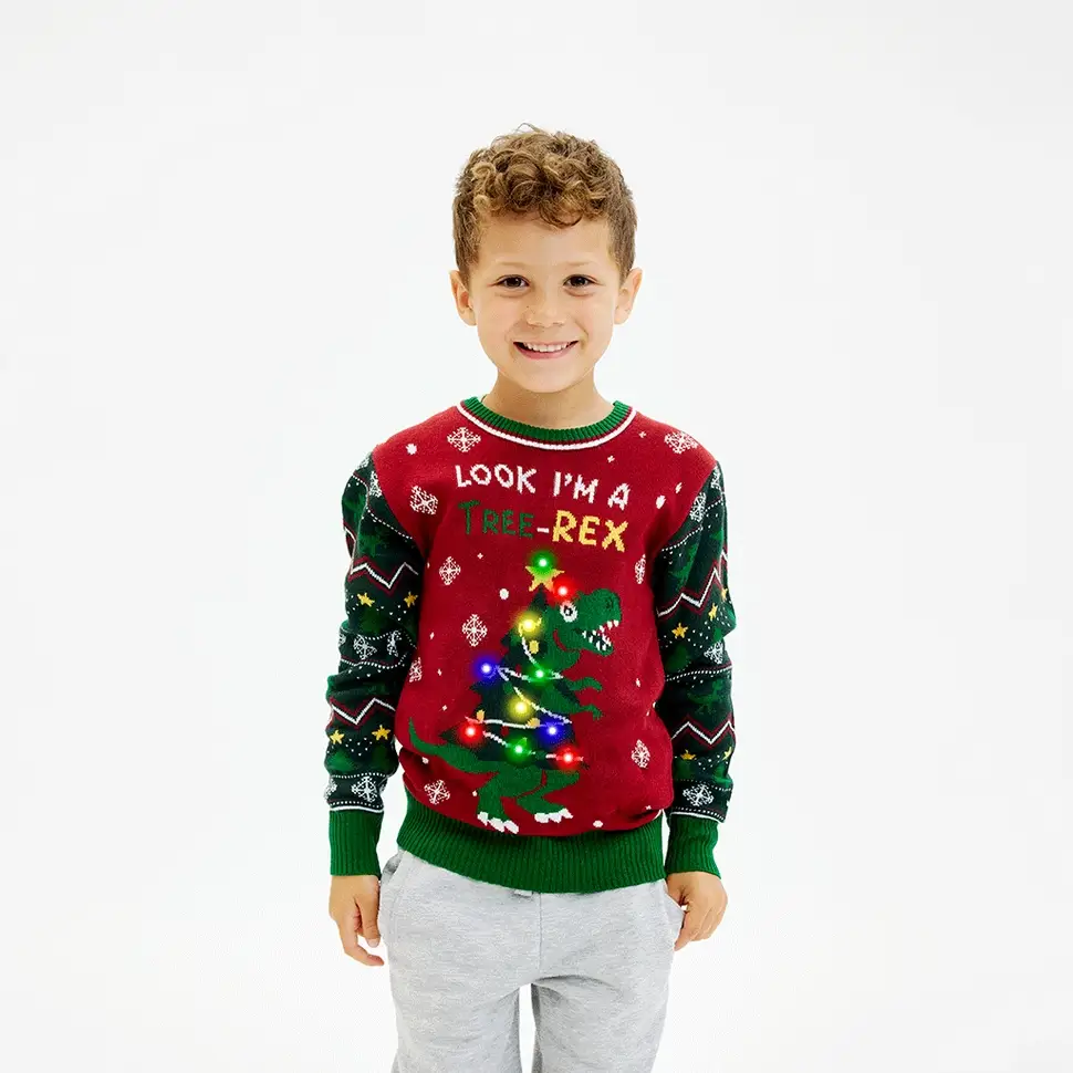 Deze kinder kersttrui met LED verlichting is zonder twijfel een hit bij uw kleintje. De kersttrui heeft een grappig dinosaurus thema, met de tekst “I’m a Tree-Rex” en een T-Rex die zo door een kerstboom gelopen lijkt te zijn. De kleurrijke LED lichtjes maken de trui nóg onweerstaanbaarder!