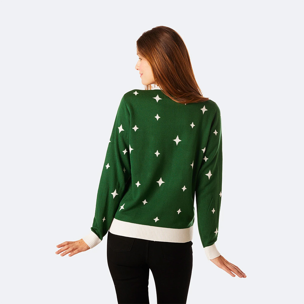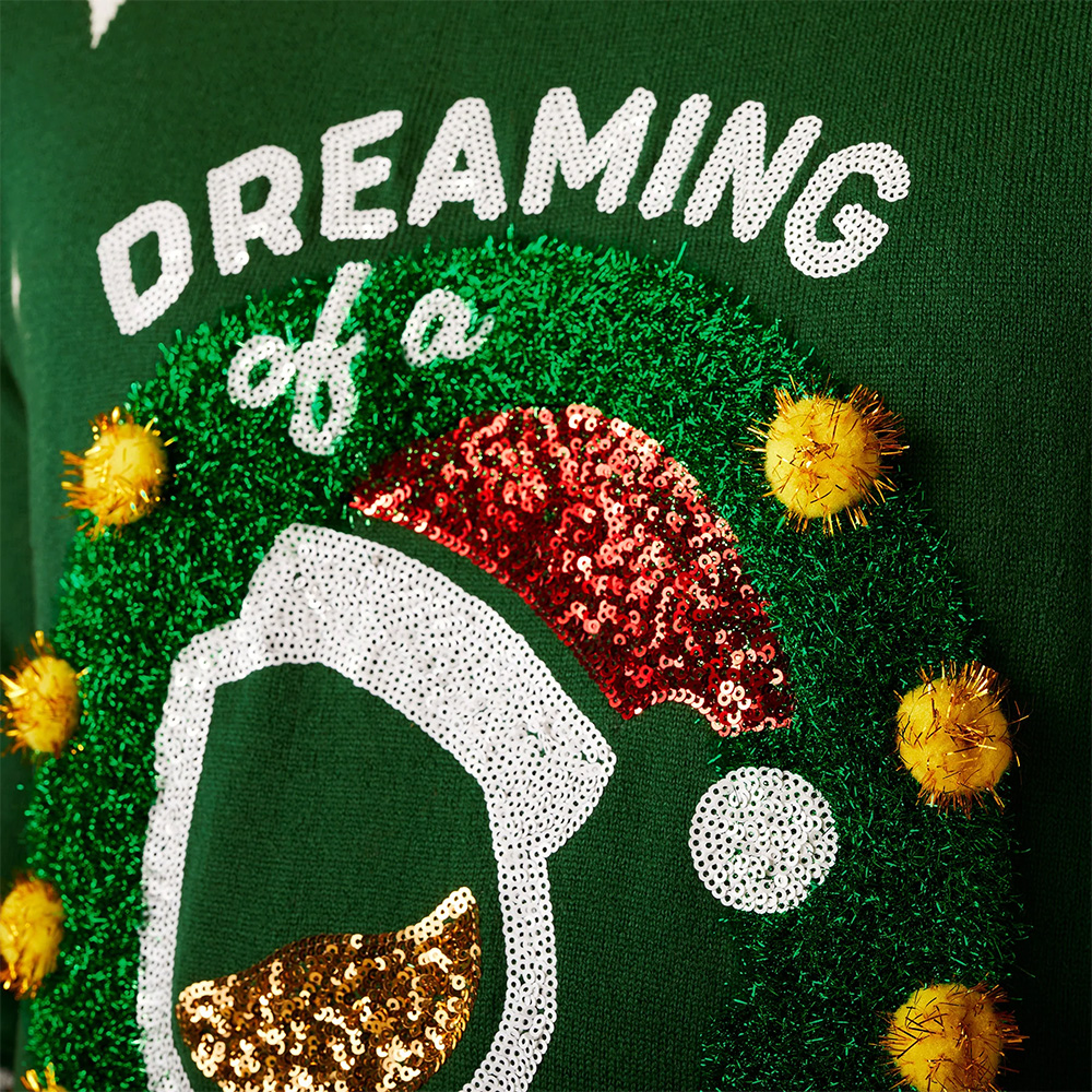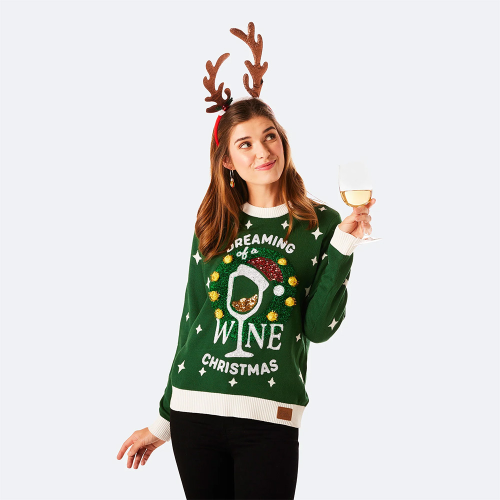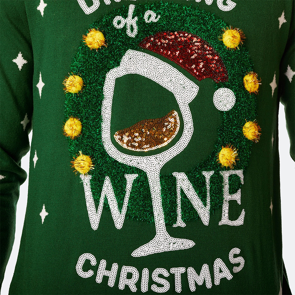 Deze wijn kersttrui voor dames maakt meteen duidelijk wat jij deze kerst(borrel) écht wilt! Deze foute kersttrui is in de basis groen met witte ster decoraties rondom, inclusief de rug en mouwen. Voorop is de trui rijkelijk gedecoreerd: zo is de tekst en het wijnglas aangebracht met pailetten, is de krans eromheen echt en zitten er echte gele balletjes in! Dit geeft de trui letterlijk een extra dimensie en zorgt ervoor dat het design van de kersttrui af spat.