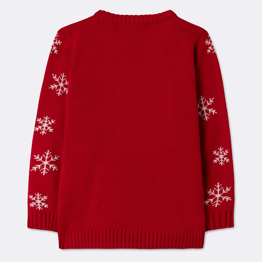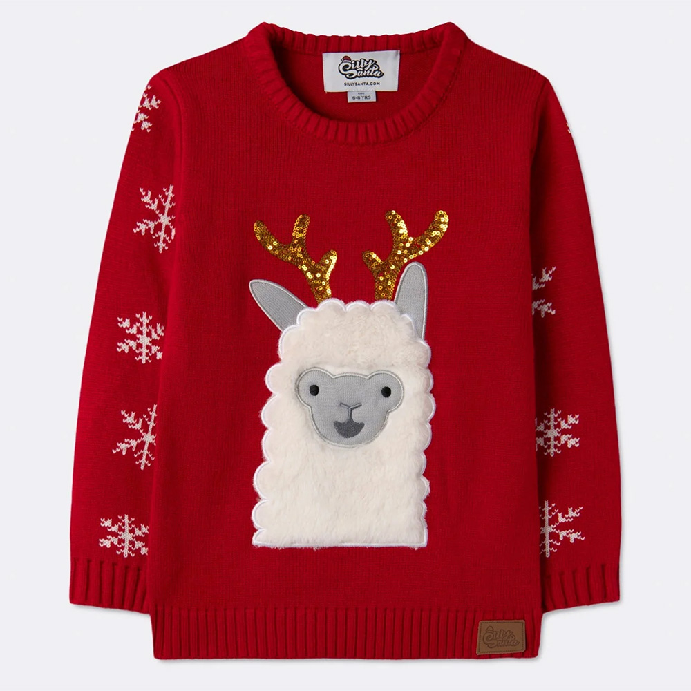 Deze schattige kinder kersttrui draagt voorop een zachte, wollige lama met een goudkleurig gewei van glinsterende pailetten. De armen zijn gedecoreerd met sneeuwkristallen.